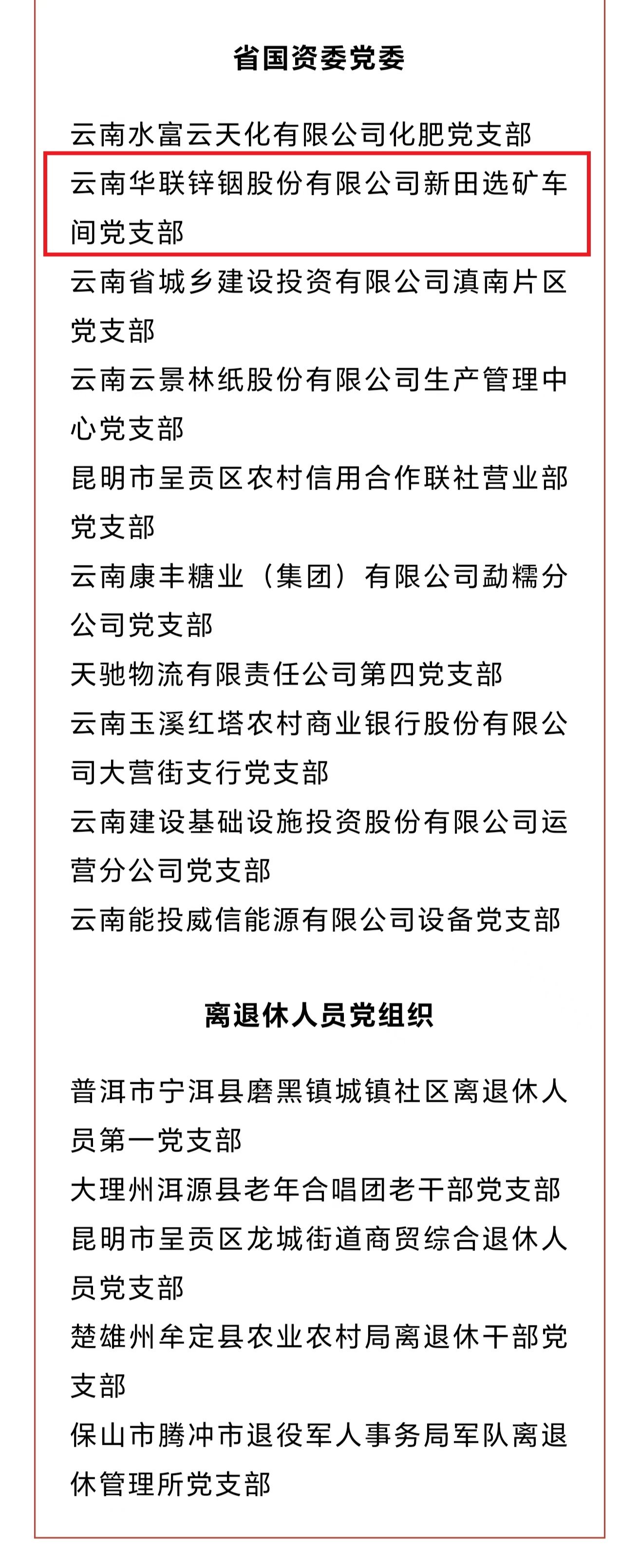 克日,中共云南省委组织部宣布了《关于命名2023年度“云岭先锋红旗党支部”的决议》,华联锌铟公司新田选矿车间党支部榜上著名。